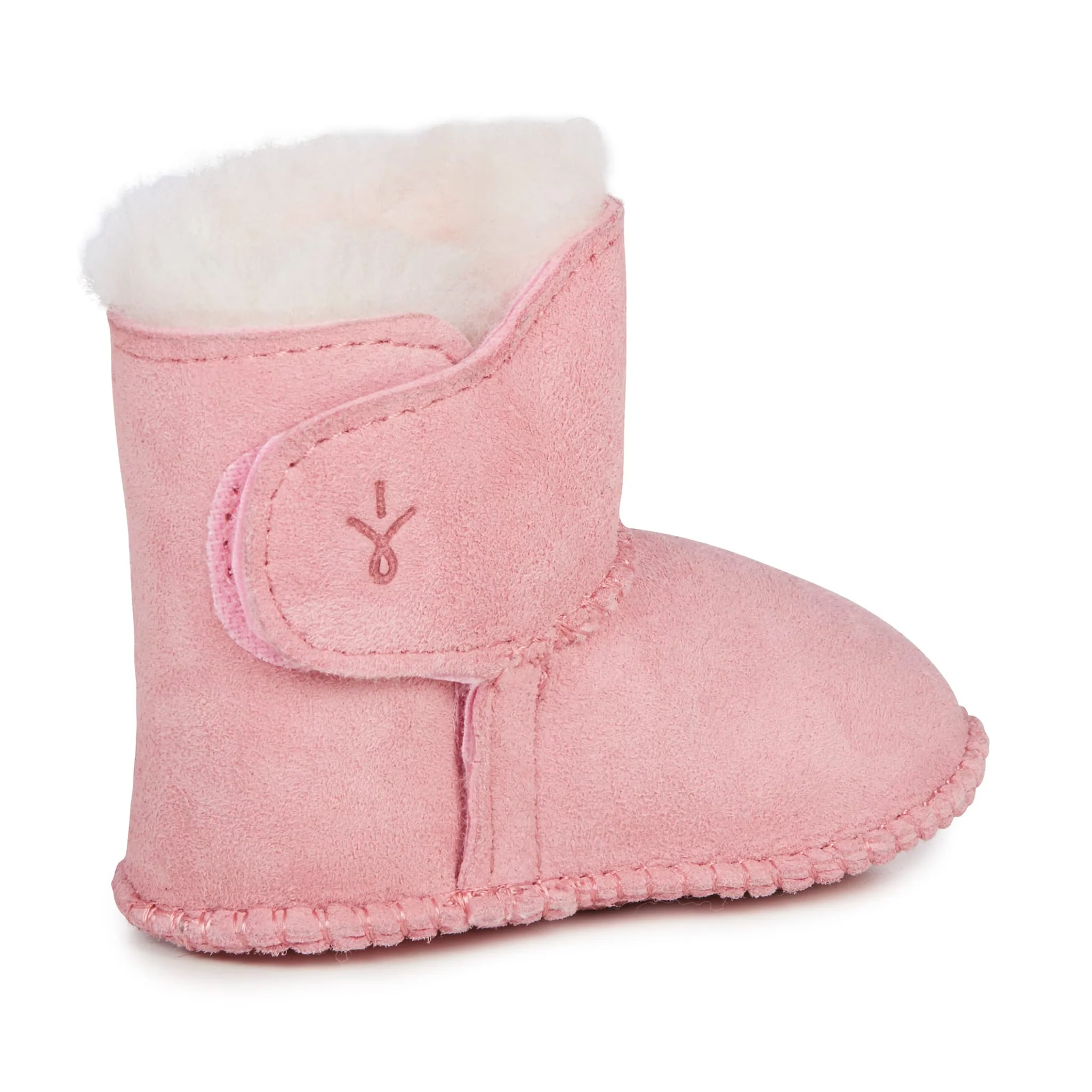 These Baby Booties are made with fluffly double face Australian sheepskin to keep feet warm and comfortable no matter the season. The soft sole allows developing feet to flex, refine and strengthen while the velcro side tab provides ease when putting on and off.